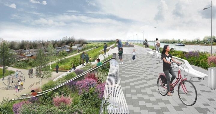 Архитектурное решение также разработано для зоны дамбы, оно позволит вписать ее в городскую среду и адаптировать под общественное пространство. Территория станет многофункциональным парком с прогулочными зонами и детскими площадками.